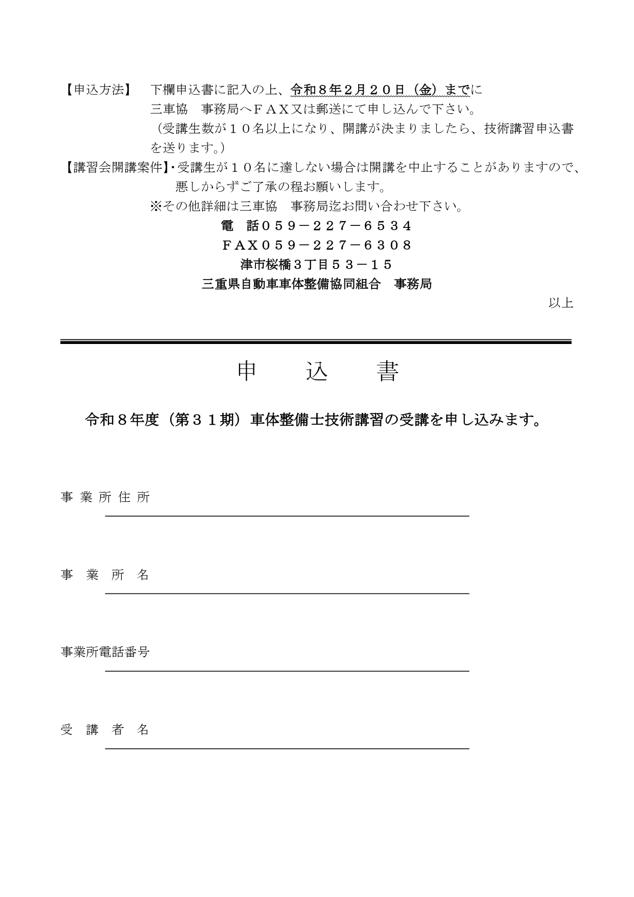 令和8年度(第31期)車体整備士技術講習生募集のご案内下記の書類をクリックするとPDFとして開きます(必要に応じ保存してください) |